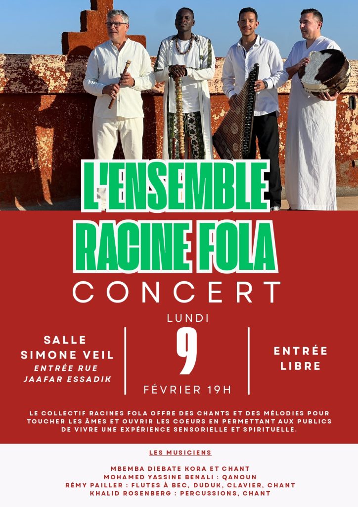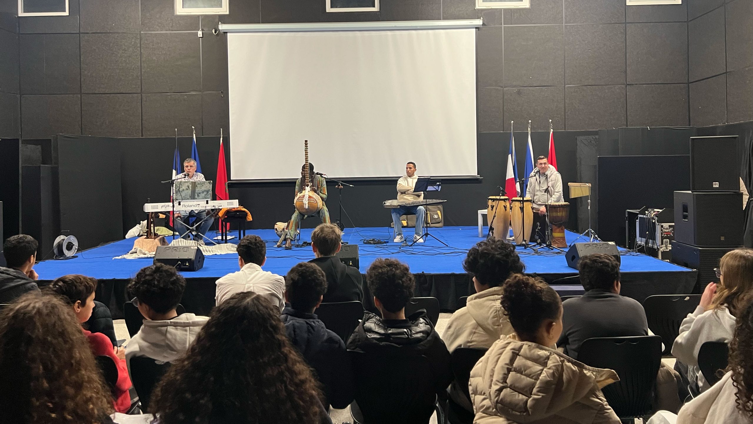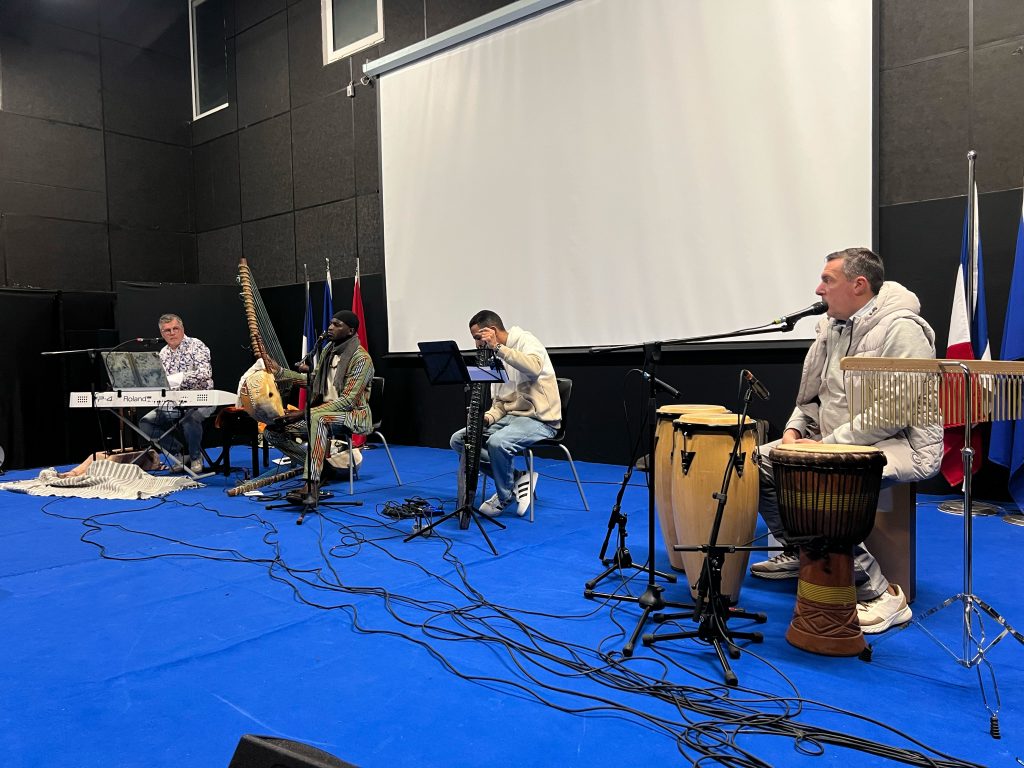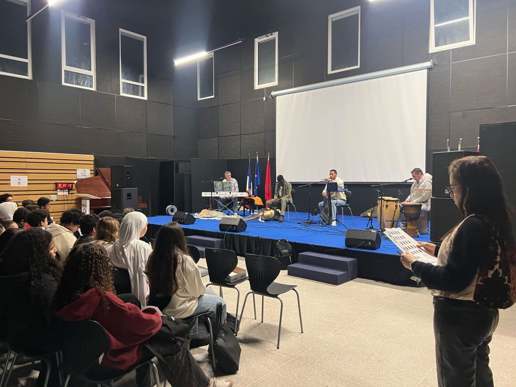Le lundi 9 février, les quatre classes de 4ᵉ de Mme Bennouna ont vécu une expérience musicale immersive à l’occasion d’un concert pédagogique interactif proposé par l’ensemble Racine Fola (France, Maroc, Sénégal).