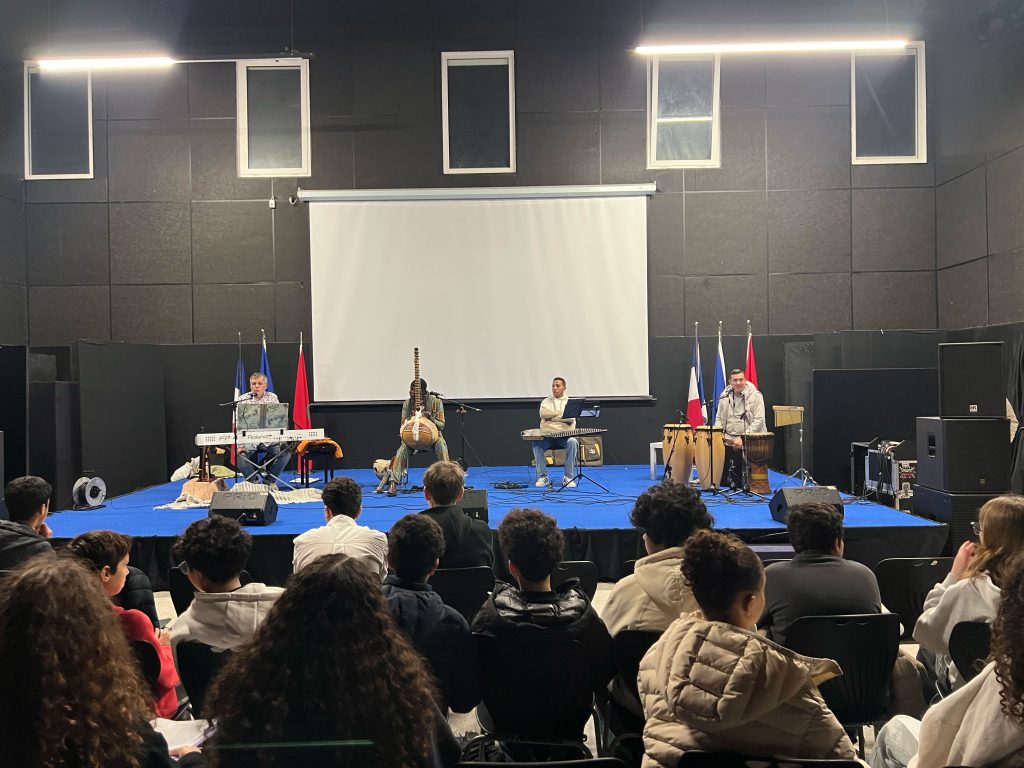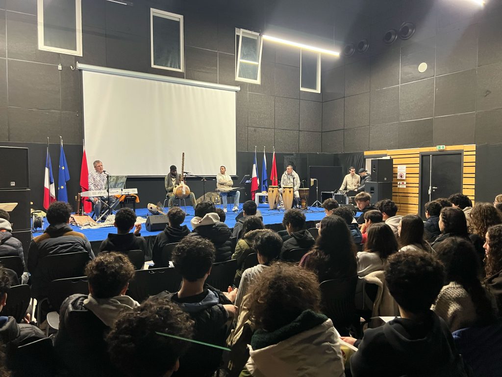Pensé comme un véritable temps d’échange et de découverte, ce concert a permis aux élèves d’explorer la richesse du métissage musical à travers un voyage sonore reliant l’Afrique de l’Ouest, le monde arabe et l’Europe. Les musiciens ont interprété des chants mandingues, arabes et espagnols, illustrant les circulations culturelles et les influences croisées qui façonnent les musiques d’hier et d’aujourd’hui.