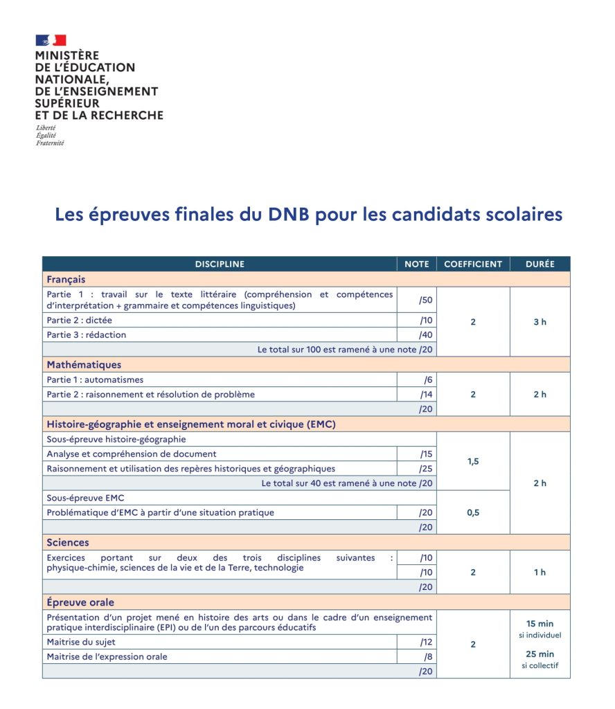 Diplôme National du Brevet – Session 2026 Date 26 septembre 2025 Dans le cadre du DNB 2026, nous mettons à votre disposition l’infographie officielle des épreuves finales pour les candidats scolaires, publiée à ce jour sur Éduscol. Vous trouverez les informations ci-dessous : Étiquette :dnb, DNB 2026, épreuves finales Partager: Amine MANNI Le post précédent Les temps forts du séjour d'intégration des 6èmes à Oualidia (2025/2026) 26 septembre 2025 Article suivant ATENA – Convocations de stage 26 septembre 2025 Vous aimerez peut-être aussi Les élèves de la voie technologiques STMG renforcent leur cohésion ! 1 octobre, 2025 La spécialité CAV au festival international du film de femmes de Salé 30 septembre, 2025 Le padel pour lancer l’année scolaire des élèves de seconde professionnelle 30 septembre, 2025