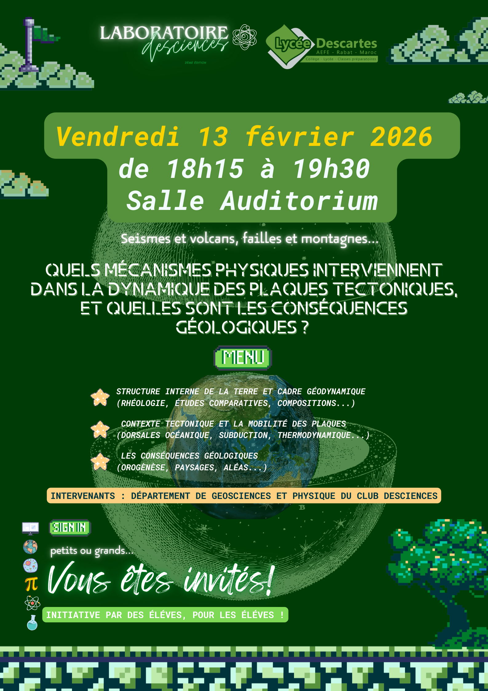 Le Laboratoire des sciences du Lycée Descartes vous invite à une conférence passionnante pour plonger au cœur de la dynamique des plaques tectoniques. Un voyage scientifique accessible à tous, entre explications claires, exemples concrets et découvertes surprenantes.