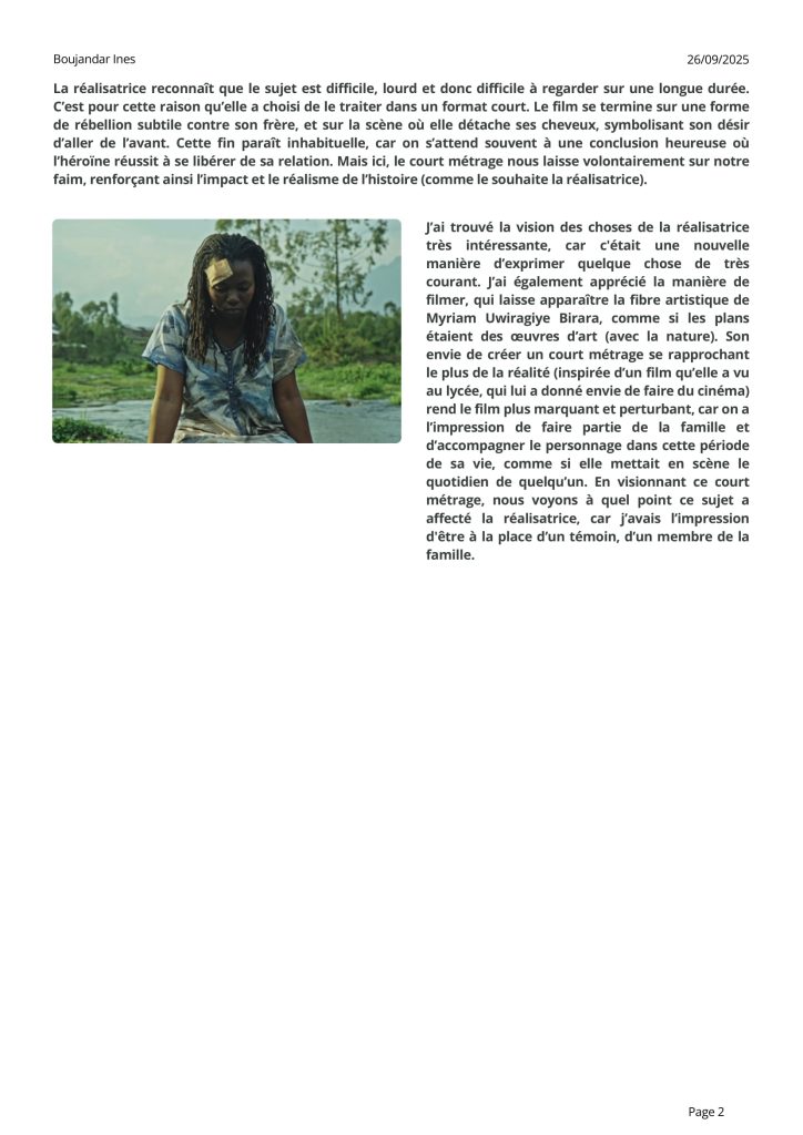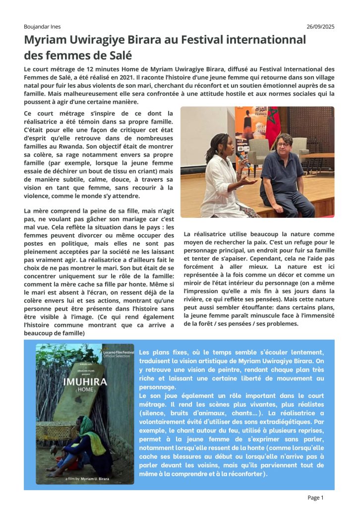 Les élèves de première et de terminale spécialité CAV ainsi que leurs professeurs se sont rendus, mercredi 24 septembre, à l’hôtel Dawliz pour rencontrer la réalisatrice rwandaise Myriam Uwiragiye BIRARA pour son film HOME. Voici un article rédigé par Inès Boujandar, élève de Terminale 11, qui fait le compte-rendu de cette rencontre.